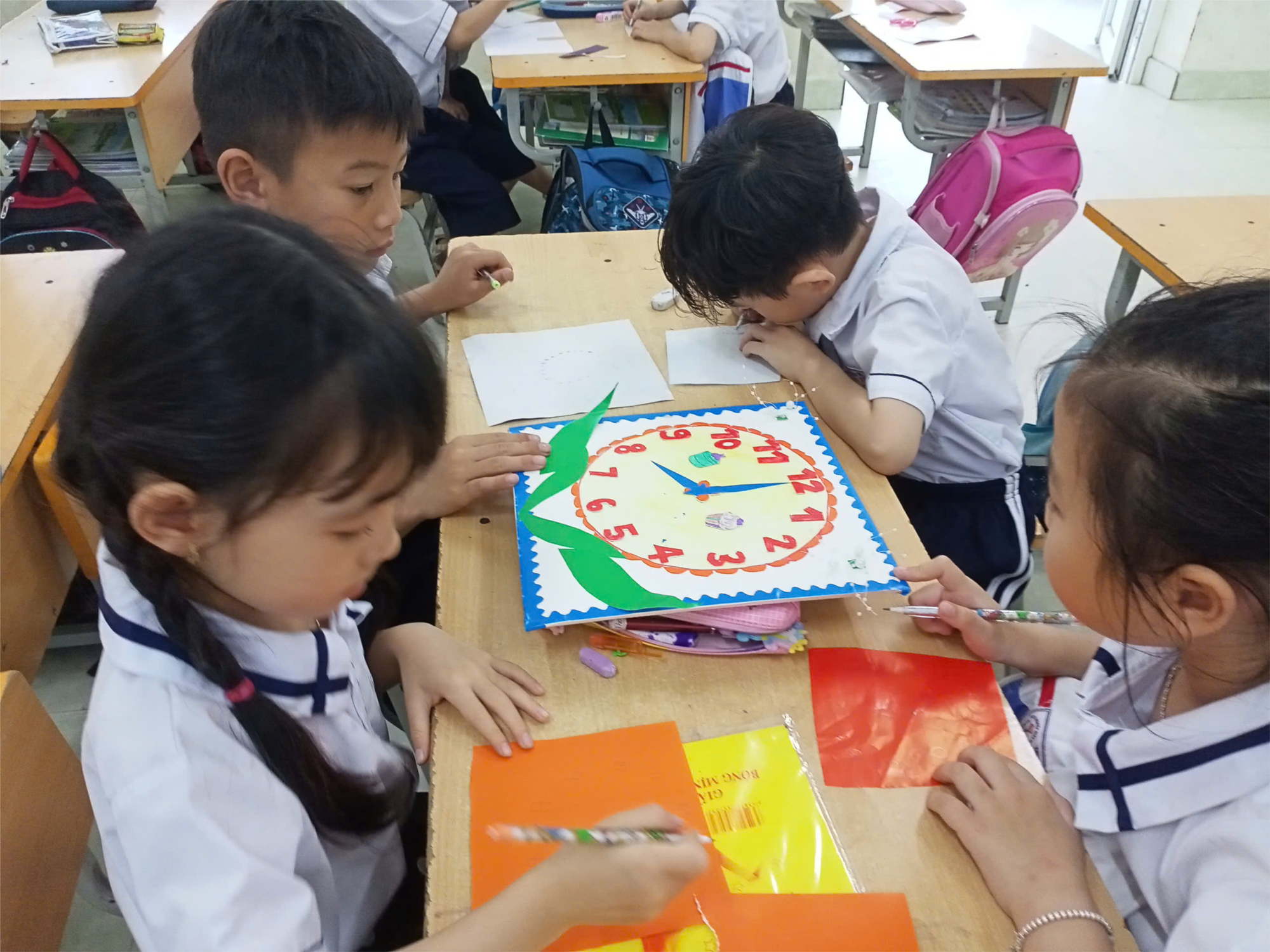 Giờ ra chơi trải nghiệm sáng tạo của các em lớp 1 thật là vui. Các em học sinh vừa chơi lại vừa trải nghiệm sáng tạo nhiều sản phẩm. Nhìn những sản phẩm này của các em thật ngộ nghĩnh và đáng yêu làm sao.