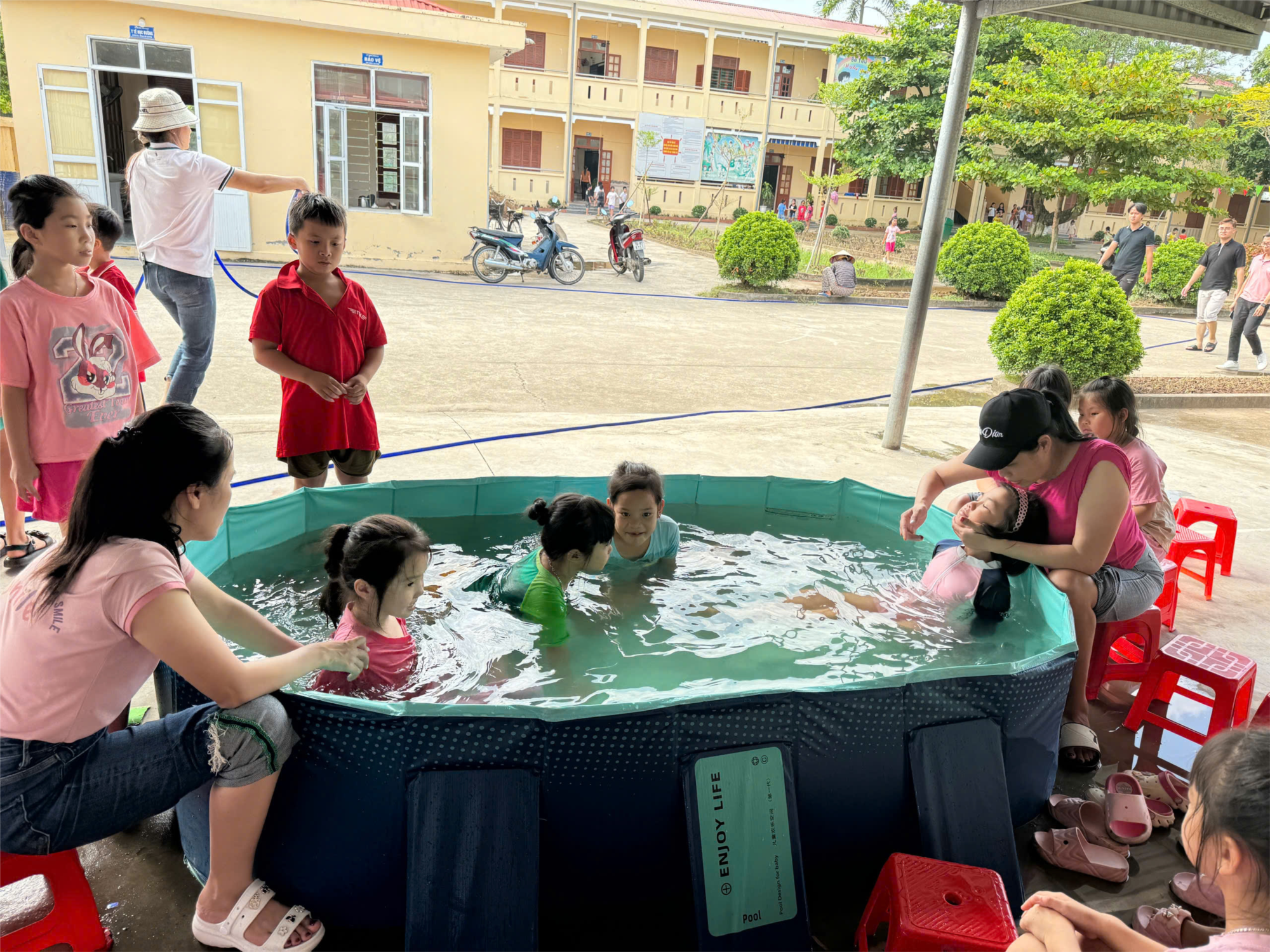 và hào hứng khi được trải nghiệm ngay trên các bể bơi mini ở trường.
