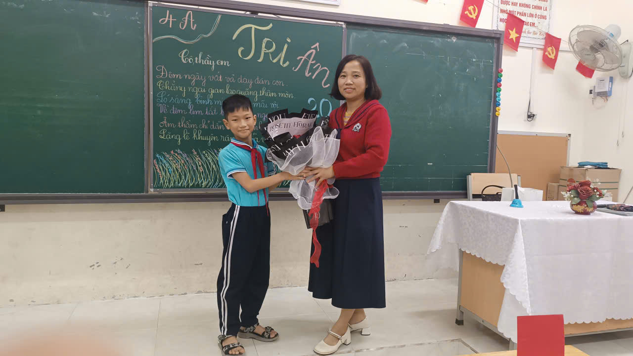 Với đôi tay khéo léo và tình cảm chân thành, các em tự thiết kế những tấm thiệp nhỏ xinh, viết nên những lời chúc giản dị mà ấm áp. Bó hoa tươi cùng thiệp chúc mừng được đại diện lớp kính tặng thầy cô như lời tri ân sâu sắc.