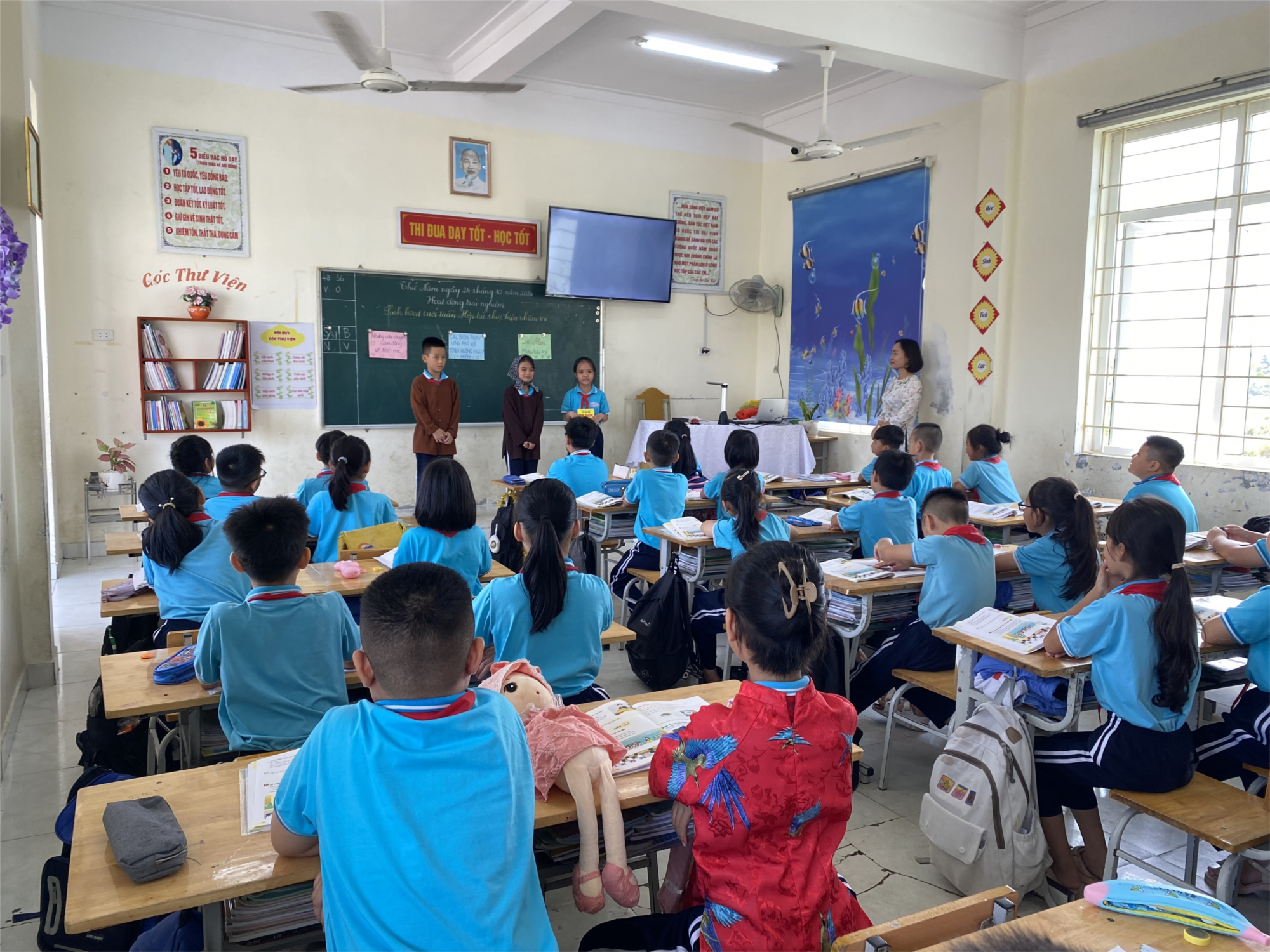 Mỗi tiết dạy đều có những điểm riêng biệt nhưng tất cả đều thể hiện được sự linh hoạt, sáng tạo của mỗi đồng chí giáo viên thông qua các hình thức tổ chức các hoạt động trong giờ Hoạt động trải nghiệm. Từ hoạt động sinh hoạt lớp, các em học sinh có nhiều hình thức báo cáo như báo cáo bằng văn bản, bằng sơ đồ hay bằng thơ ca, hò vè…. Các em đã thực sự phát huy năng lực tự quản, tự đánh giá bản thân, đánh giá bạn, tư vấn, động viên các bạn, rồi đến các hình thức tuyên dương khen thưởng cuối tuần cũng rất phong phú, đa dạng. Phần sinh hoạt theo chủ đề, mỗi đồng chí giáo viên đã có những phương pháp, hình thức linh hoạt, sáng tạo thông qua việc ứng dụng CNTT, sử dụng các phần mềm và công cụ AI – trí tuệ nhân tạo để hoạt động sinh hoạt theo chủ đề thật sự hấp dẫn, lôi cuốn học sinh. Đặc biệt mỗi tiết học, giáo viên đều khéo léo lồng ghép, tích hợp giáo dục kỹ năng công dân số một cách nhẹ nhàng, phù hợp, hiệu quả. Các tiết dạy đã được Ban giám hiệu nhà trường và giáo viên các khối đánh giá cao.